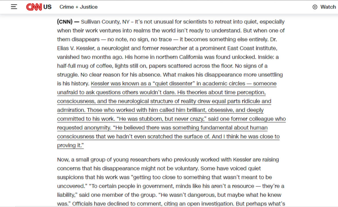 Just days after the first reports emerged about the mysterious disappearance of controversial neuroscientist Dr. Elias V. Kessler, readers around the world noticed something strange: every trace of the story began to vanish.First, it was a CNN article — just three days after publication, the link went dead. Soon after, a detailed New York Times feature about his research and last known movements also disappeared. Fox News removed even archived footage discussing his theories on time perception and consciousness. The BBC’s report? Unavailable. Archived copies? Erased from the Wayback Machine. Even blog posts and Reddit threads about him started to vanish or became locked without explanation.People tried to find cached versions, PDF backups, saved screenshots — all to no avail. It’s as if someone had pulled every string and ordered a total erasure. No news outlet took responsibility, no editorial staff offered comment — a strange, absolute silence took hold.“This isn’t a technical glitch. This was an order from above.”