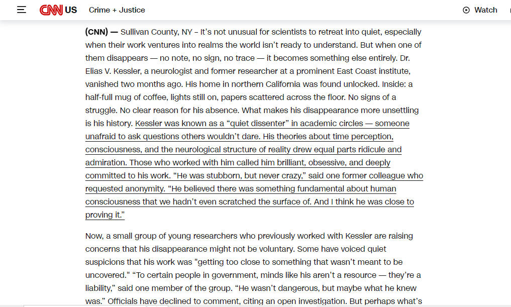 Just days after the first reports emerged about the mysterious disappearance of controversial neuroscientist Dr. Elias V. Kessler, readers around the world noticed something strange: every trace of the story began to vanish.First, it was a CNN article — just three days after publication, the link went dead. Soon after, a detailed New York Times feature about his research and last known movements also disappeared. Fox News removed even archived footage discussing his theories on time perception and consciousness. The BBC’s report? Unavailable. Archived copies? Erased from the Wayback Machine. Even blog posts and Reddit threads about him started to vanish or became locked without explanation.People tried to find cached versions, PDF backups, saved screenshots — all to no avail. It’s as if someone had pulled every string and ordered a total erasure. No news outlet took responsibility, no editorial staff offered comment — a strange, absolute silence took hold.“This isn’t a technical glitch. This was an order from above.”